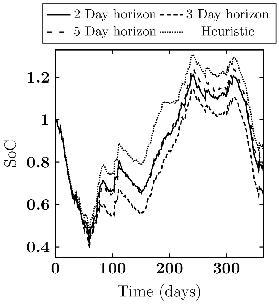 The second scenario uses a demand temperature, , of 60 °C. It is immediately clear from the results given in Figure 9 that the solutions of both the ILP and heuristic are significantly worse than for the case with a demand temperature of 40 °C. In general the objective values are higher, while the state of charge (see Figure 10) at the end of the optimization is much lower compared to Figure 7 and Figure 8. This was to be expected as for a higher demand temperature the buffer has a lower useful energy content for the same temperature distribution in the buffer. When comparing the ILP solutions for different horizons the two and three day horizon solutions look very similar. However, the solution for a five day horizon has a significantly higher objective value, which may seem surprising. A closer look shows that this result is due to the stopping criteria (Section 3), in particular due to the maximum run time per step. For the case using a five day horizon one hour is simply not enough time to find good solutions for some of the steps in the scenario with a high demand temperature. Note, that for this case it takes already around 150 hours to solve the optimization over the whole year. As a consequence simply increasing the maximum run time per step by a meaningful amount is not a realistic solution to this problem.