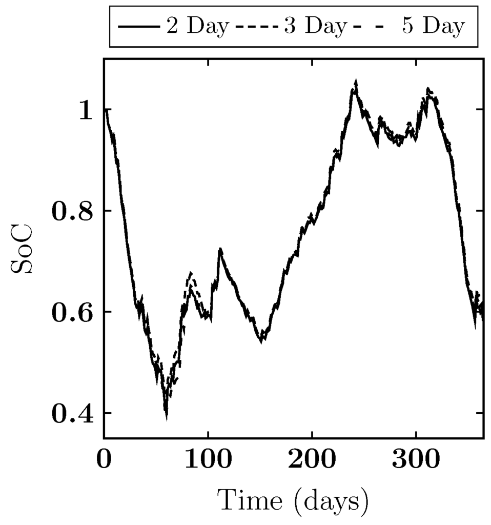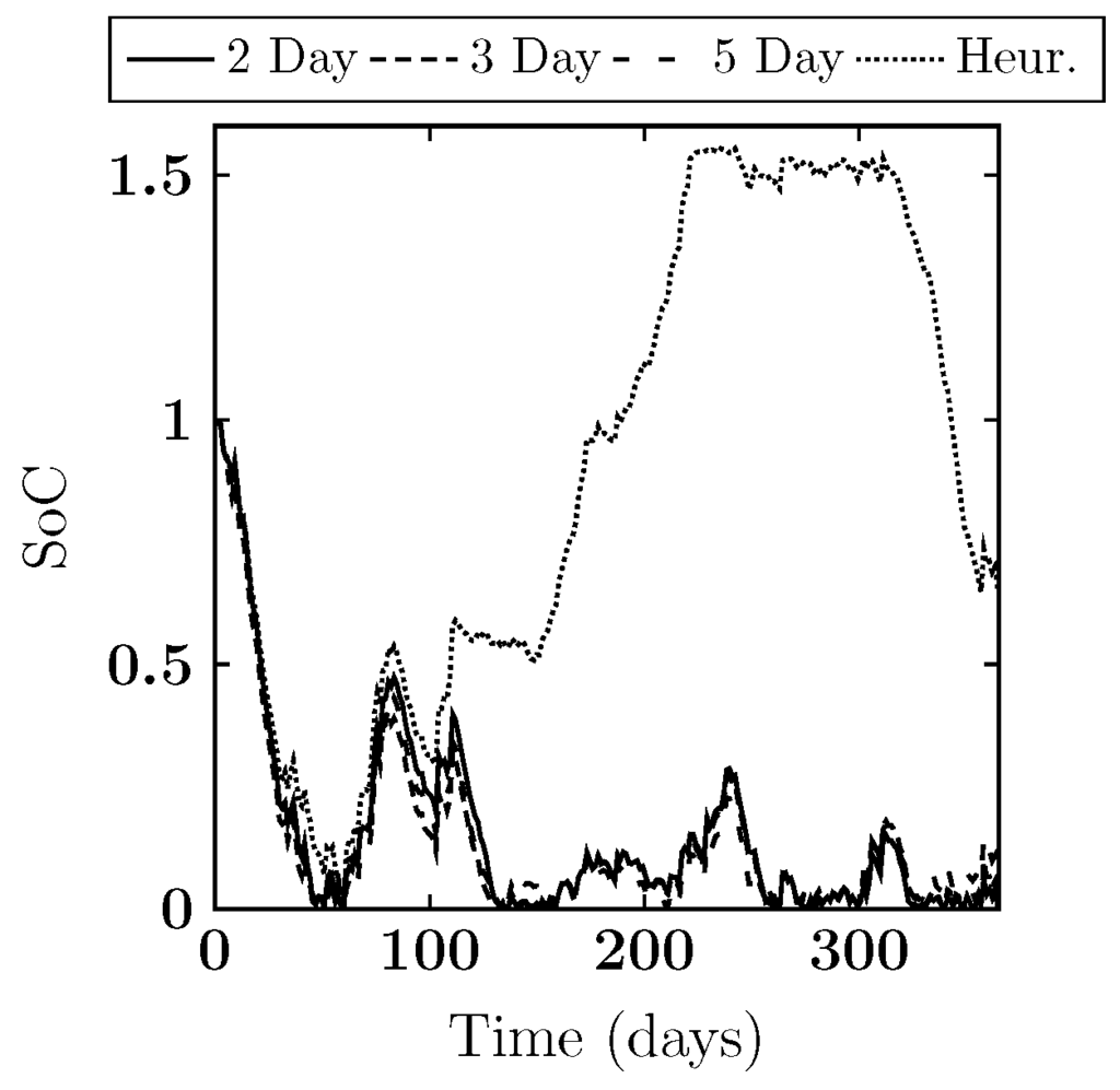 Comparing the heuristic to the ILP solution for two and three day horizons shows that the difference in objective values is a lot larger than for a lower demand temperature scenario (Figure 7). However, this is somewhat mitigated by the fact that the difference in state of charge is also larger. In this scenario the heuristic model is hurt even more by the fact that it can not look ahead for future opportunities.