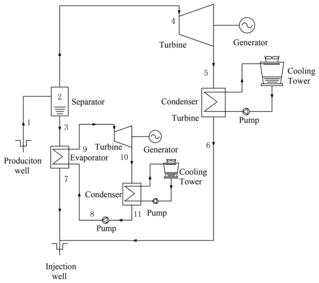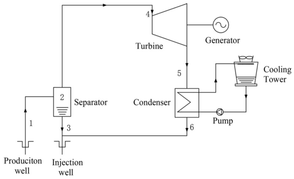 The schematic diagram of single-flash (SF) geothermal power generation system is shown in Figure 1. The geofluid from a geothermal reservoir is sprayed into a separator, which is at a pressure lower than that of the geofluid, causing some of the geofluid to rapidly vaporize (flash). The vapor then flows into a turbine to generate shaft work that drives a generator for electricity. The liquid that remains in the tank of the separator is reinjected into the reservoir. The exhaust steam from the turbine is directed to a vacuum condenser where it is condensed into water and is then reinjected into the reservoir.