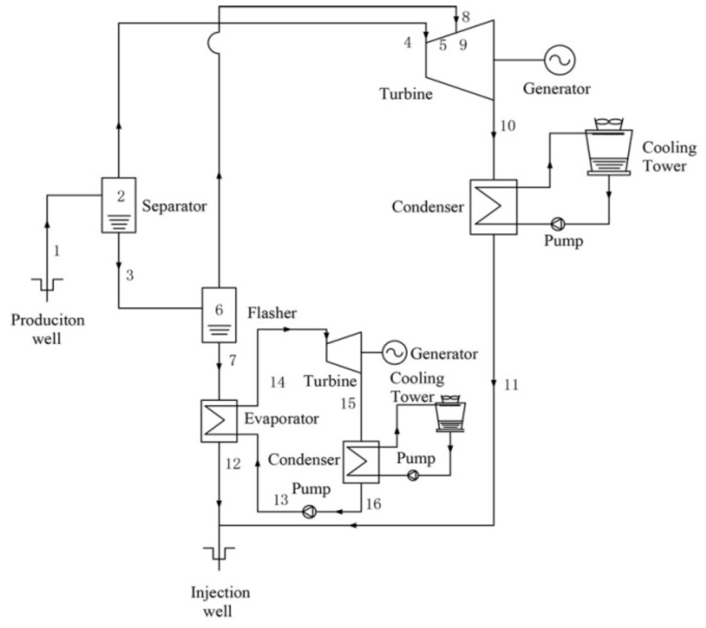 - Wang, J.; Wang, J.; Dai, Y.; Zhao, P. Thermodynamic analysis and optimization of a flash-binary geothermal power generation system. Geothermics 2015, 55, 69–77. [Google Scholar] [CrossRef]