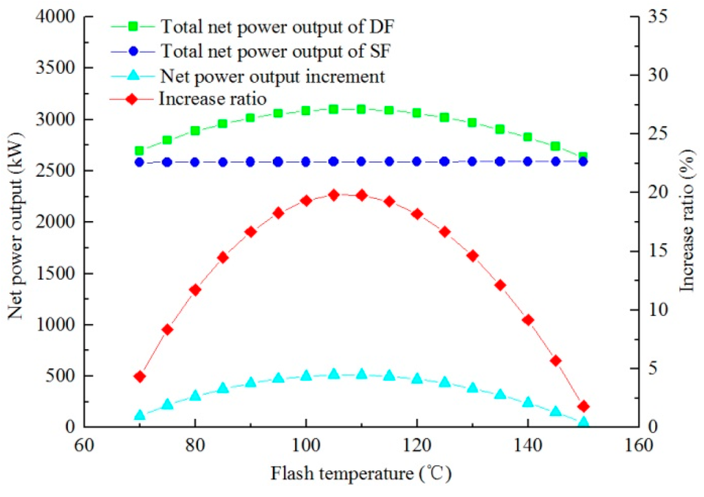 Figure 5 shows the variations of net power output of DF with flash temperature at geofluid temperature 160 °C, steam dryness 0.2, and geofluid rate 150 t/h. By comparing DF with SF, it is clear that DF system can produce more electricity. Obviously, the net power output increment rises at first and then decreases, and it has an optimum value at flash temperature of 110 °C. Two factors are responsible for the phenomenon above: one is the steam that is generated from the flasher and supplied to the turbine, the other is the steam’s specific available energy, which is a function of temperature and pressure. Higher flash temperature (higher flash pressure) results in higher specific available energy but with less steam; lower flash temperature (lower flash pressure) leads to lower specific available energy but with more steam. Therefore, an optimum flash temperature exists for DF system at the given condition, at which temperature it can produce the maximum electricity.