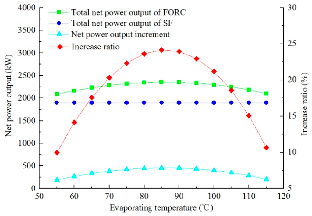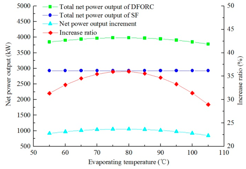 Figure 7 shows the variations of net power output of DFORC with different evaporating temperatures under the following conditions: geofluid temperature is 180 °C; steam dryness is 0.2; geofluid flow rate is 150 t/h. It can be observed that the trend of the net power output change of DFORC is similar to that of the FORC system. The working fluid flow rate and the specific available energy are the dominant factors. From Figure 7, the optimum evaporation temperature of the DFORC system is 80 °C.