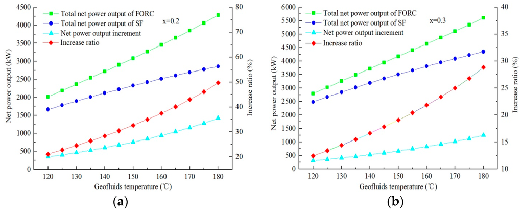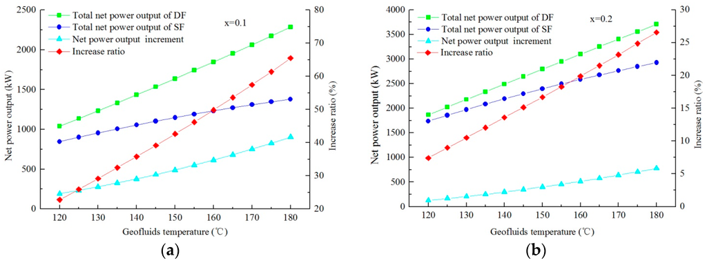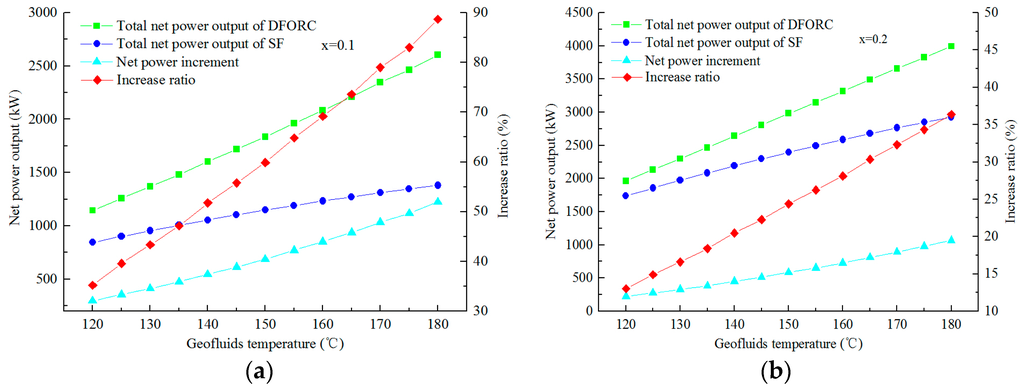 Figure 10 shows the variations of net power output of DFORC with geofluid temperature for steam dryness of 0.1 and 0.2. It is obvious that the relationship presented in Figure 10 is similar to that in Figure 8 and Figure 9. A higher geofluid temperature leads to a higher net power output and a higher net power output increase ratio. In addition, the effect of the DFORC system on improving the net power output is more obvious at a lower steam dryness condition. Comparing Figure 10a with Figure 8a, it can be observed that adding the ORC subsystem to the DF system has more contribution to the net power increase ratio for its advantage on utilizing medium and low temperature geothermal energy. Therefore, DFORC is more suitable for power generation using geofluids with relatively higher temperature and dryness.