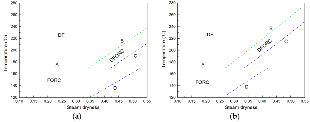 Figure 11b shows a selection map for the net power increase ratio of 15%. The main difference between Figure 11a,b is the boundary joints. The difference can be explained by the effect of the steam dryness. Since a lower steam dryness can increase the net power increase ratio of DF, FORC, and DFORC systems under the same geofluid temperature, in order to obtain a higher net power increase ratio, the boundary lines (lines B, C, and D) have to be located in the lower steam dryness region. For instance, the boundary line (line B) between the DF and DFORC system in Figure 11a starts at a steam dryness of 0.35, whereas it starts at steam dryness of 0.26 in Figure 11b.