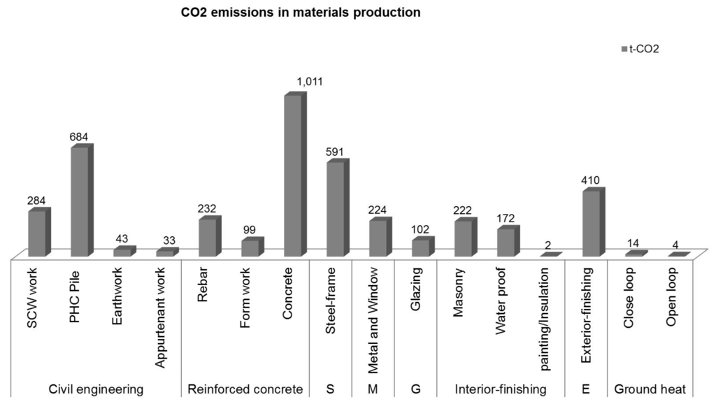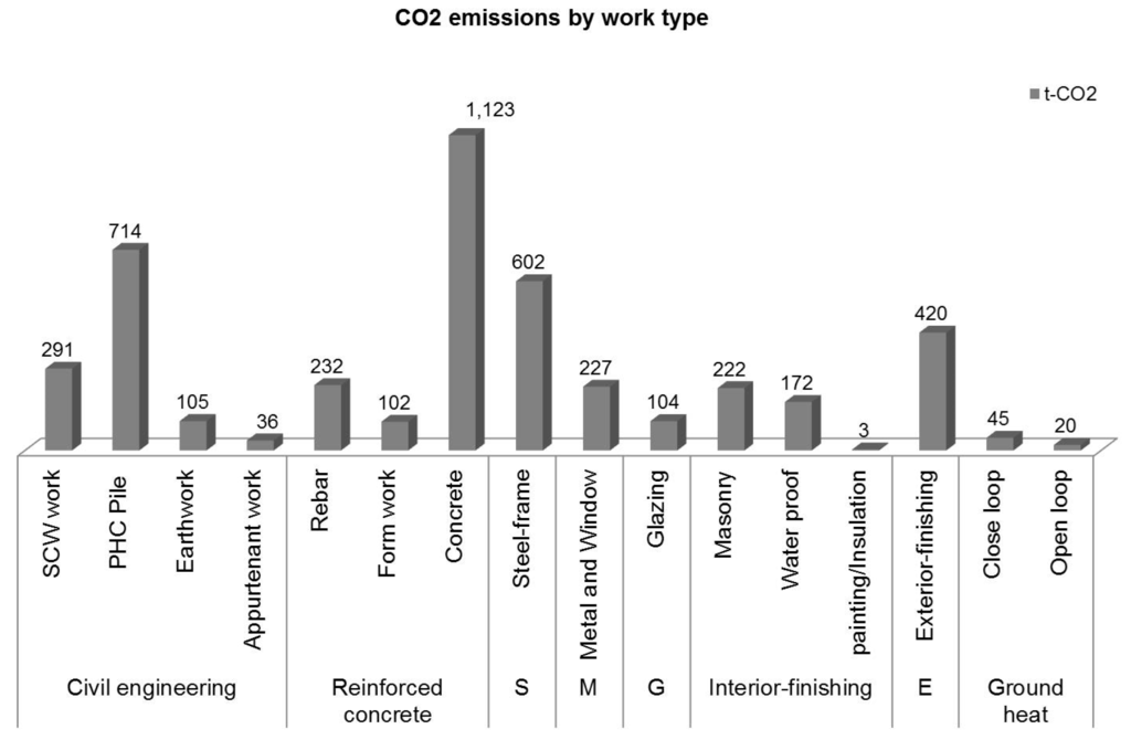 Table 2, the construction cost was highest in the exterior work, followed by reinforced concrete work and steel structure construction. Related to this, civil engineering works showed high CO