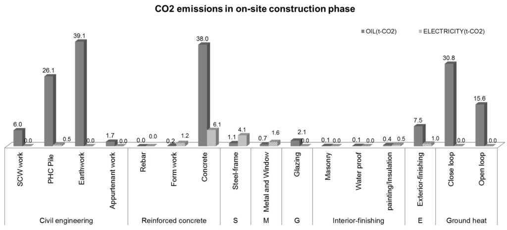 In the case of CO2 emissions from the on-site construction phase, CO2 emissions were estimated to be high in processes that require high energy consumption due to the use of construction and lifting equipment. For the detailed process, CO2 emission was calculated to be highest in concrete construction, earthworks, foundation (PHC PILE) work, and ground heat system construction. These processes are classified as those in which CO2 reduction controls are available in terms of on-site management; thus, substantial construction management is required for the reduction of CO2 emissions. This needs to be achieved through the establishment of optimal plans for the selection of materials and methods, the creation of the best construction proposals, energy consumption monitoring of the construction process, and performance management from the design phase. The amount of CO2 emissions from the on-site construction phase of metal/window work was only 1% compared to that from the material production phase. Thus, measures to recycle and reuse the existing metal materials need to be considered in terms of the efficiency of resources. The use of unnecessary metal materials needs to be reduced and alternative materials need to be selected. The energy consumption in the interior finishing works, including masonry/plaster work, waterproofing work, and painting/insulation work showed a relatively smaller consumption pattern compared to that of other work types. This is because the above processes require a great deal of man power compared to using construction equipment.