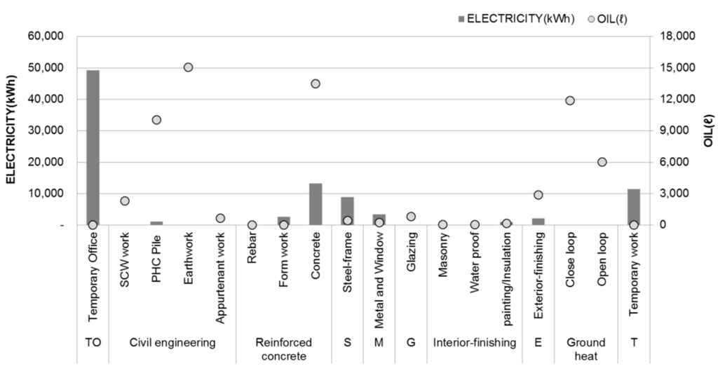 The amount of energy consumption in the on-site construction phase was subdivided into oil and electricity consumption for calculation. Oil energy sources were limited to diesel oil; gasoline and kerosene were excluded from the evaluation due to their minimal usage. The amount of electricity consumption was analyzed based on the measurement data after setting a remote meter reading plan prior to starting construction work. For monitoring of electricity consumption, the usage was divided into common temporary work, temporary office, direct construction, and lifting equipment as shown in