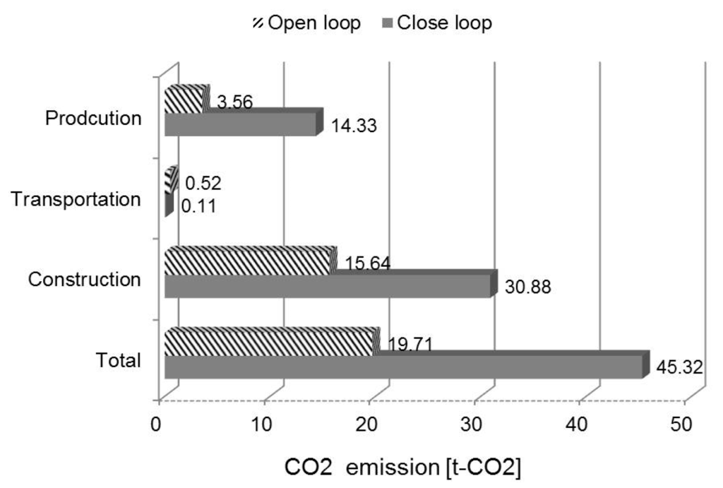 2 emission from the construction phase was doubled in the closed type compared to that of the open type. In this study, the capacity of the closed type was 58 RT and that of the open type was 52 RT. Therefore, the open-type method of ground heat construction is expected to become a more environmentally friendly component technology if it secures the same energy performance as the closed-type method.