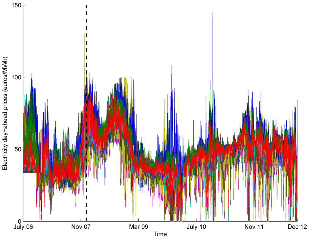 We study a dataset of spot prices for the Iberian (Spain and Portugal) electricity market from July 2006 to December 2012. The dataset is presented in Figure 1. There is a common pattern in the evolution of the hourly series. The period before 2008 (Figure 1 to the left of the dashed line) is only used as historical data; the first predicted day is 1 January 2008 and the last one 31 December 2012.