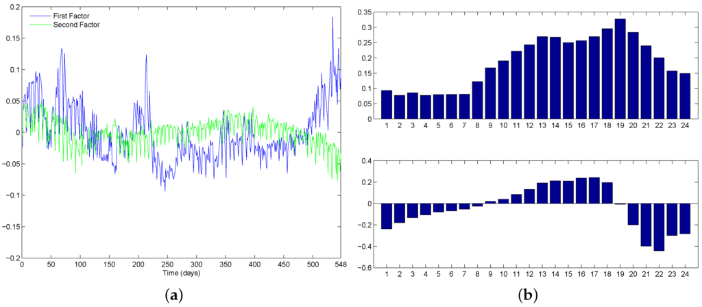 Let be an m-dimensional observed time series vector, generated by an r-dimensional vector of unobserved common factors . In the Iberian electricity market , and the matrix of observed series has as many rows as days are considered in the historic dataset. As in [], it is assumed that vector can be written as a linear combination of the unobserved common factors , plus a vector of specific components or factors :