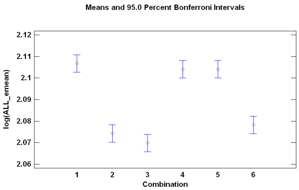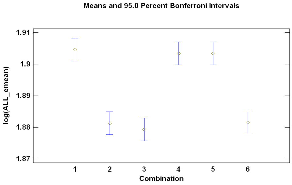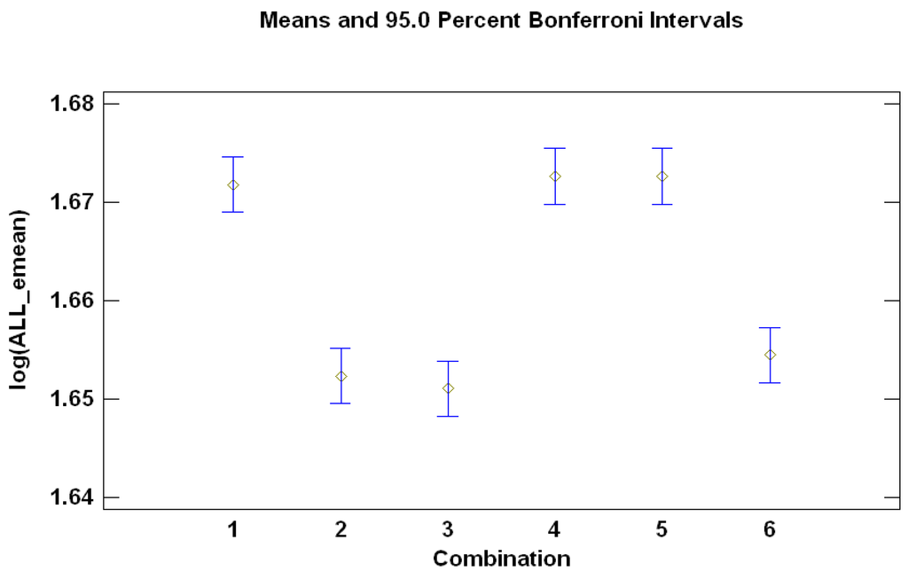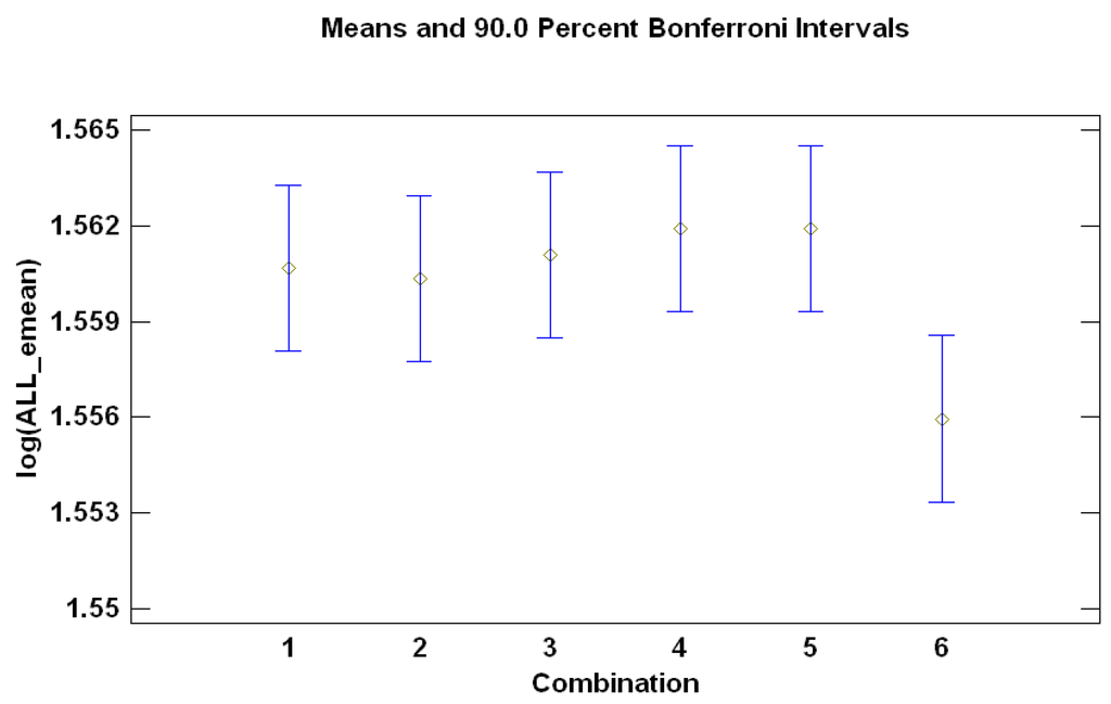 For seven-day-ahead forecasts (), there are three combination results that outperform the rest: numbered as Combinations 2, 3 and 6. This result is presented in Figure A4. As with the one-day forecast horizon, the Bonferroni correction applies here given the relatively large number of levels for the factors.