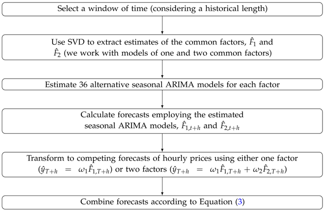 Regarding applications in electricity markets, [] extended [,] to prices with seasonality. Working with data for the Iberian market for 2007–2009, they propose extracting common factors from the 24-dimensional price vector and modeling such factors as univariate seasonal AutoRegressive Integrated Moving Average (ARIMA) processes. The work in [] proposes a technique called Seasonal Dynamic Factor Analysis (SeaDFA), which involves the estimation of a Vector AutoRegressive Integrated Moving Average (VARIMA) model for unobserved common factors having seasonal patterns. The work in [] also uses a factor model, including not only hours, but also locations.