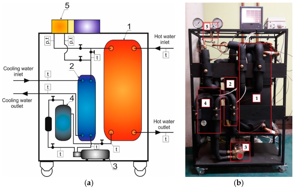 The simplified construction scheme of the test-stand and a general view of the test-stand. (a) The simplified construction scheme of the test-stand; (b) A general view of the test-stand: (1) plate evaporator; (2) plate condenser; (3) working fluid pump; (4) working fluid reservoir; and (5) multi-vane expander.
