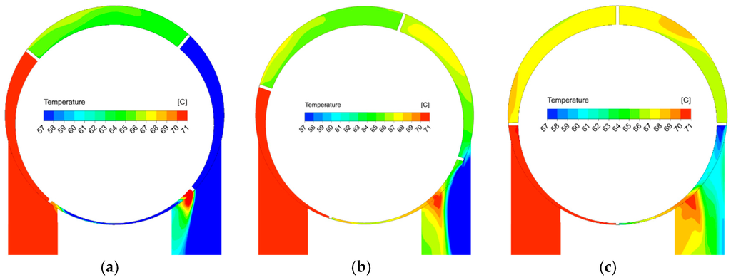 The temperature distribution inside the expander for expansion ratio σ = 4.3. (a) ϕ = 1.50π; (b) ϕ = 1.75π and (c) ϕ = 2.00π (ideal gas model).