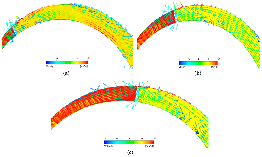 Velocity vectors in a working chamber with visible recirculation zone. (a) ϕ = 1.50π; (b) ϕ = 1.75π and (c) ϕ = 2.00π (ideal gas model).