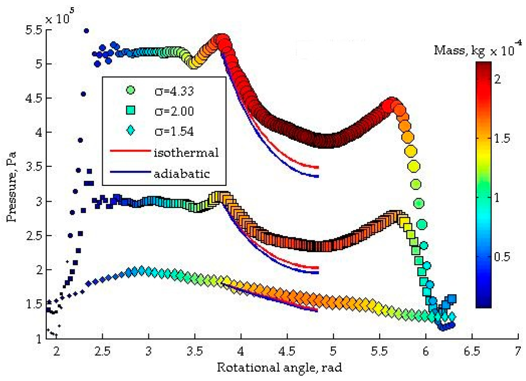The mean pressure evolution inside a working chamber is presented in Figure 9. The size of the symbol and its color indicate the mass of the medium inside the chamber volume at given time. Three main cycle phases may be observed: filling, expansion, and evacuation. The characteristic is consistent with the results of Jia et al. [24] who tested and modelled similar multi-vane machine. The distinctive feature observed in the obtained characteristic [24] is the pressure growth before the end of the expansion. This negative feature results from symmetric design of the analyzed expander and improper arrangement of the outlet port. Non continuous expansion significantly and negatively influences the expander power output. In the analyzed expander, four working chambers coexist in one moment in time. A single working chamber changes its volume continuously during one full rotor revolution. In the beginning of the revolution, the working chamber volume is small and it increases with the rotor movement. The maximum volume of the working chamber is reached in the half of the shaft revolution. During the next part of the shaft revolution, the working chamber volume decreases again. Thus, the working fluid is first expanded and then re-compressed (aforementioned pressure growth in Figure 9) before the work cycle is completed. In the properly designed expander the recompression should be minimized, this effect can be achieved by changing the expander design to asymmetric or changing the outlet port placement [10]. As it can be observed in Figure 9, after the re-compression the working fluid is rapidly evacuated from the working chamber (ϕ = 3.8–4.3 rad) through the outlet port without further energy conversion. The re-compression effect vanishes for σ < 1.6 as a result of lower rotational speed of the expander.