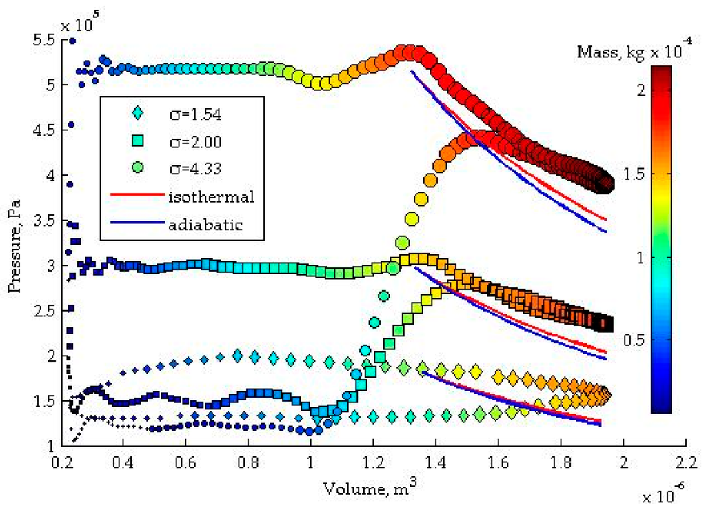 The pressure–volume diagram for an ideal gas model. Dot size represents the medium mass inside the working chamber.