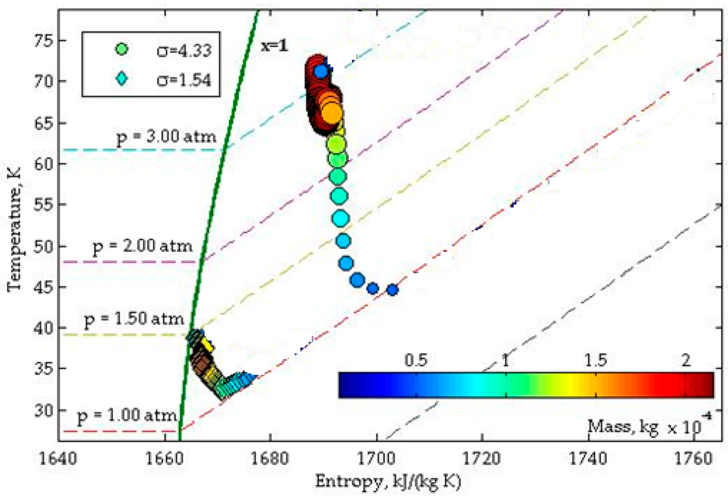 Figure 11 shows the expansion process in the T–s plane. By analyzing Figure 11 it is seen that during the expansion entropy increases as the numerical model takes into account viscosity of the fluid. Resulting expansion is polytropic and limited in a 65–75 °C temperature range (red circles in Figure 11). However, as it was mentioned earlier, the design of the expander causes limited enthalpy drop. The expansion process should proceed to the lower pressure and corresponding temperature at the outlet. The visible temperature increase, during the expansion, corresponds to the re-compression process observed in p–V chart (Figure 10).