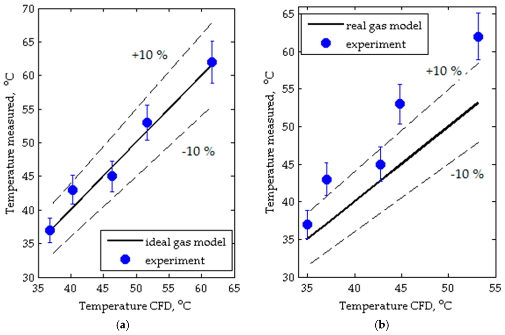 Numerical temperature deviation from the measured values. (a) Ideal gas model; and (b) real gas model.