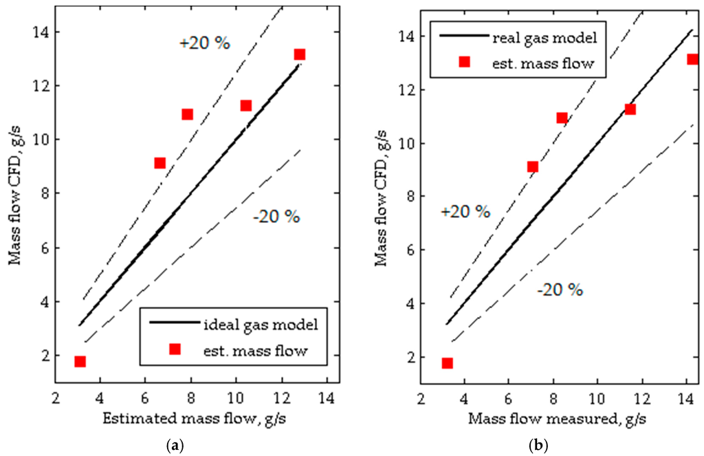 Comparison between numerical and the mass flow rate estimates (Equation (5)) for different pressure ratios. (a) Ideal gas model; and (b) real gas model.