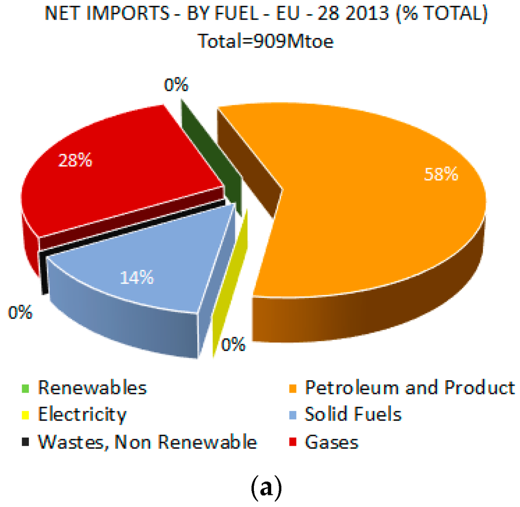 The dependency of the European Union on energy imports [10,11]. (a) Percentage distribution of imports by fuels for the year 2013; (b) Raw materials imported out of the total necessary amount. Adapted from [10] with the permisison from © European Union, 2015.