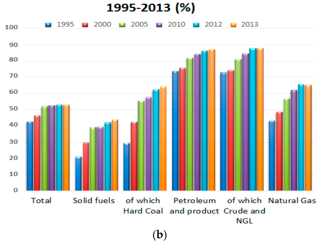 The statistical data reported show that during the period of time 1995–2013 energy imports from outside the EU increased from 43% to 53.2% for the whole primary energy sources (Table 1, Figure 1) [8], these imports being generated by the economic growth, the population growth, the development of transports, etc. The structure of EU imports for 2013 by category of fuels can be seen in Figure 1a, being dominated by petroleum and its derivatives.