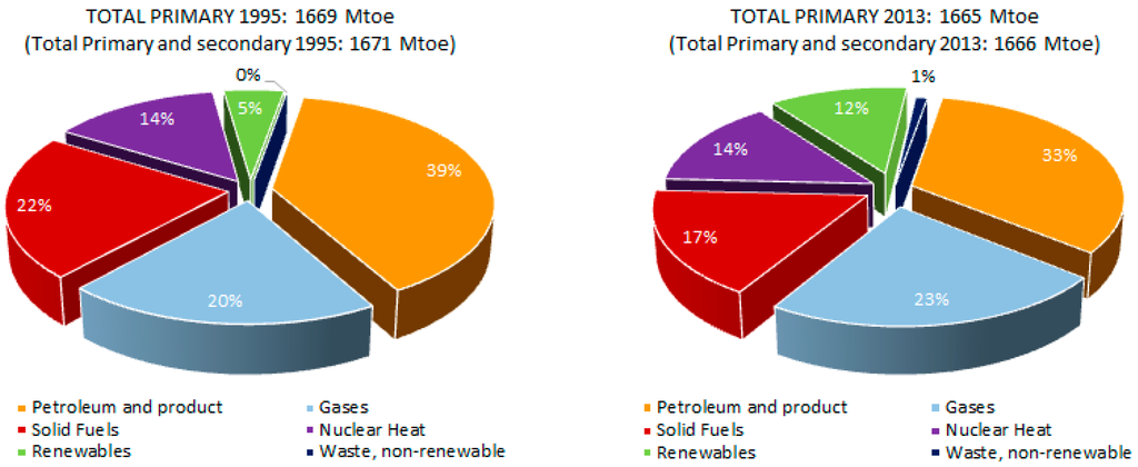 Energy Mix 1995 and 2013 (%)—Primary Products Only [10,11]. Adapted from [10] with the permisison from © European Union, 2015.