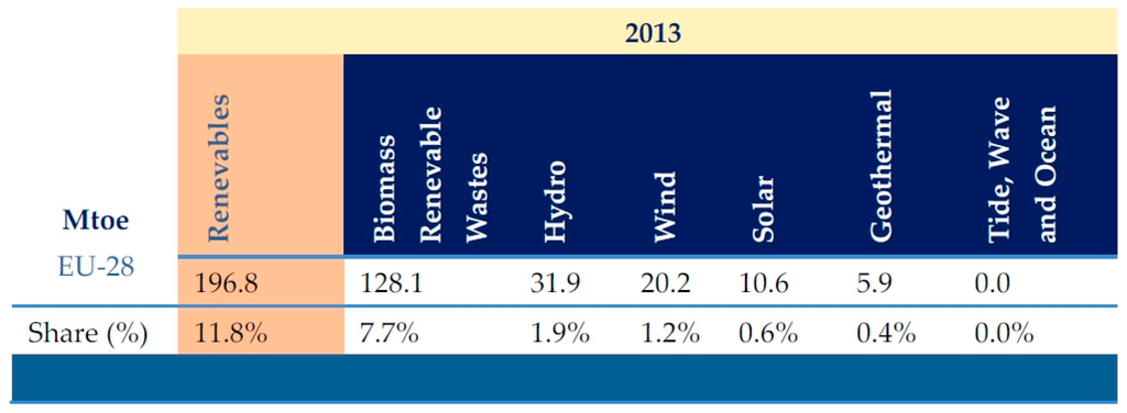 During the same period of time (1995–2013), there was an increase in the exploitation of renewable energy sources which represent 11.8% (12%) of the total primary energy sources at the end of 2013, starting from 5% in 1995 (Figure 2) [10]. It can be observed that during the two years, 1995 and 2013, the primary energy production is approximately equal, being 1669 Mtoe in 1995 and 1665 Mtoe in 2013, respectively.