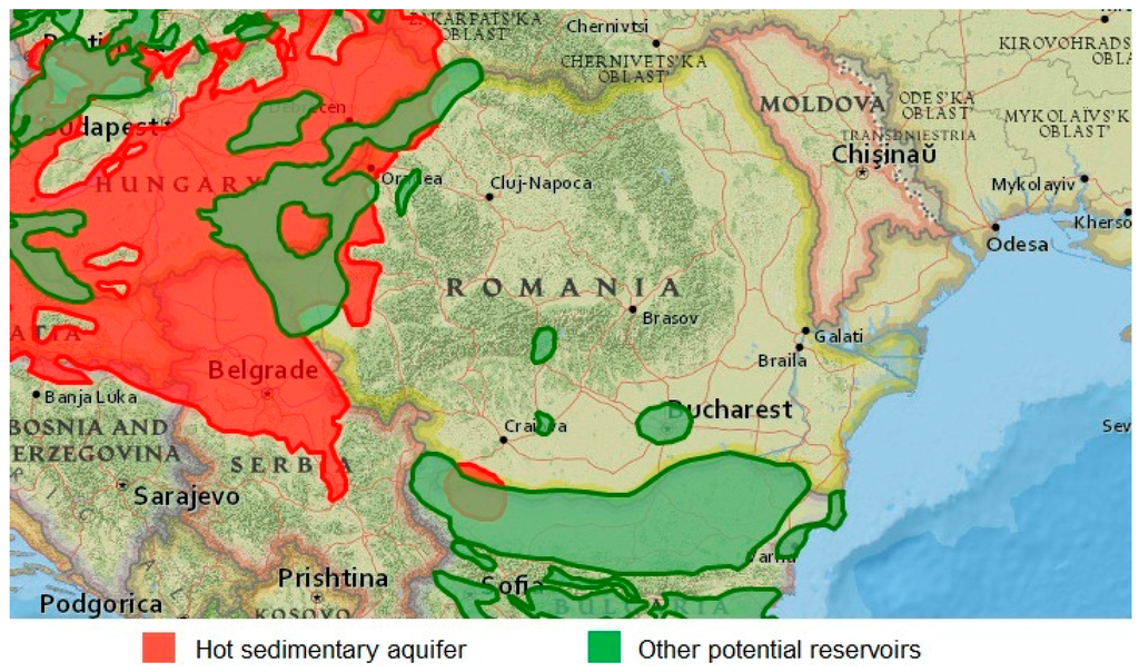In the case of Romania, most of the geothermal resources discovered are located in the porous permeable formations in the east of the Pannonian Basin (Figure 4). This area, situated on the western border of Romania (between the town of Satu Mare to the north and Timisoara City to the south), has an area of about 2.500 km2 and includes an aquifer situated at depths varying between 800 and 2400 m, having temperatures between 50 and 85 °C [22,25].