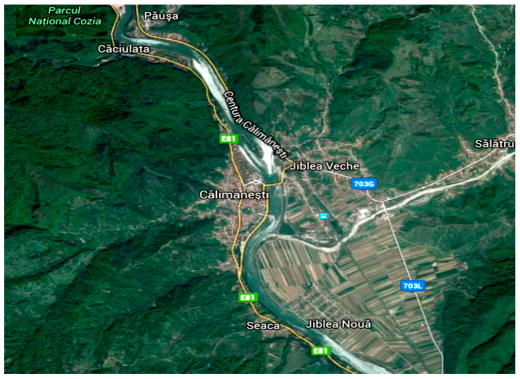 Călimanesti is a set of small villages with the same administration, known in the touristic guidebooks as the Călimănești-Căciulata balneo-climateric resort. The community is situated in a very picturesque natural landscape, at the bottom of the Southern Carpathians, at the altitude of 260 m, along both banks of the river Olt. The town is positioned 18 km north of Râmnicu Vâlcea, the county capital, and from the administrative point of view it is made up of the following communities: Calimanesti, Caciulata, Cozia, Seaca—situated on the right bank of Olt river, and Păuşa, Jiblea Veche, Jiblea Nouă—situated on the left bank (Figure 10). The town spreads over 10.632 ha, 264 ha of which are built-up area [29].