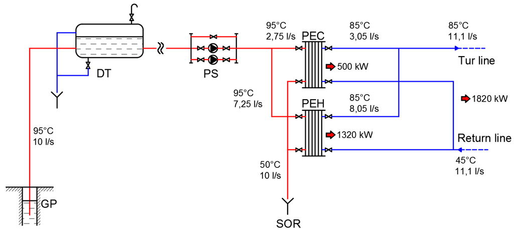 The basic design of the geothermal power station, adapted from [30] with the permisison from © General Association of Engineers in Romania, 2016; where: DT—degassing tank; PS—Pumping Station; GP—Geothermal; PEC—Plate exchanger for hot water consumption; PEH—Plate exchanger for hot water heating; SOR—Spill into Olt River.