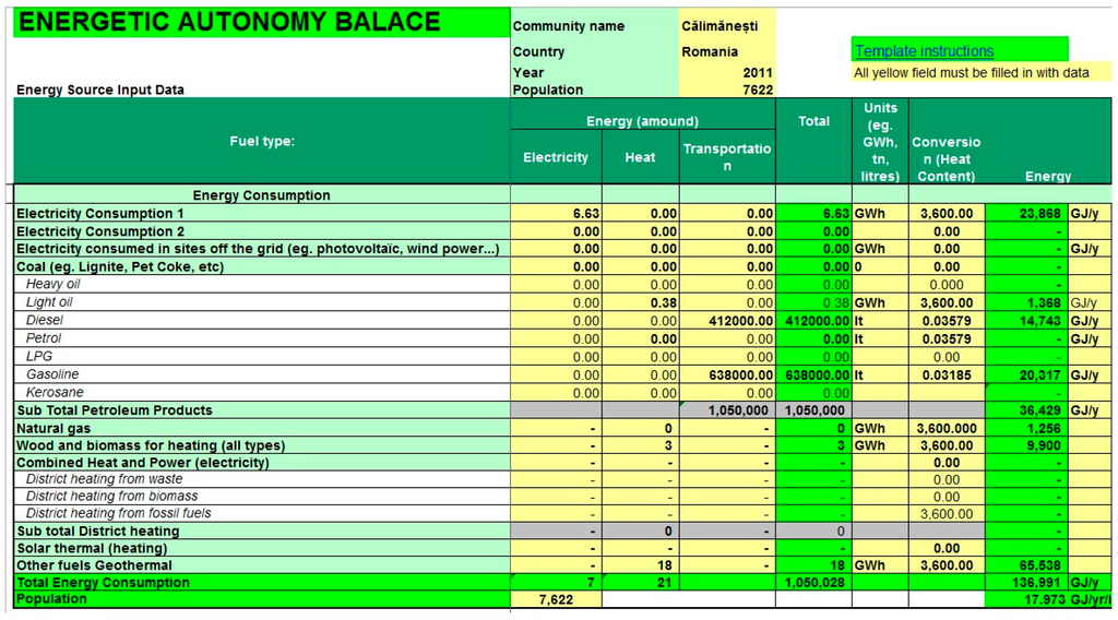 The method uses mainly two great categories of data: the energy consumption and the energy production on the level of the community [27]. By comparing these data, the degree of energy independence/autonomy of that community and the way in which it produces the energy necessary for its own proper functioning can be determined. Basically, the method can be applied to any administrative structure: a large or a small community, a neighbourhood, a county, a development region and through extrapolation, it can even be applied on national level. However, it is important to mention that the amount of data which have to be collected is proportional to the area where the methodology is applied and the accuracy of the assessment depends on the precision of these data.