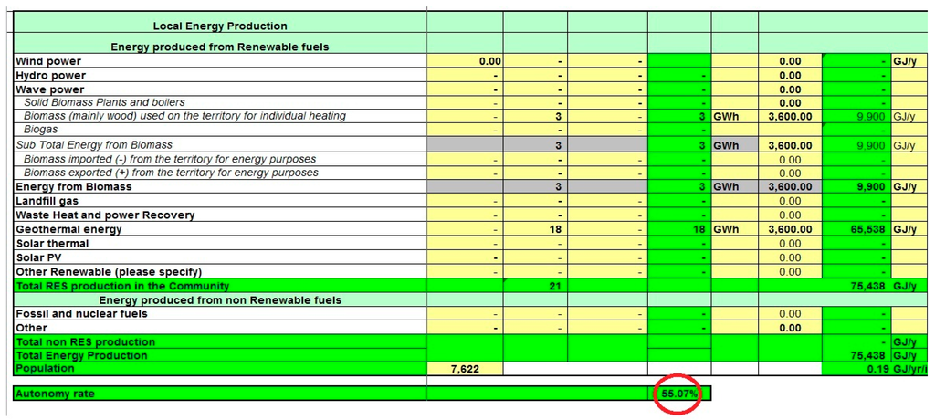 As we can observe, the energy autonomy rate is of 55.07%. The contribution of the geothermal energy to this percentage is of 86.9%. When the fuel necessary for transportation is included, the percentage of the energy autonomy rises to 74.01%.