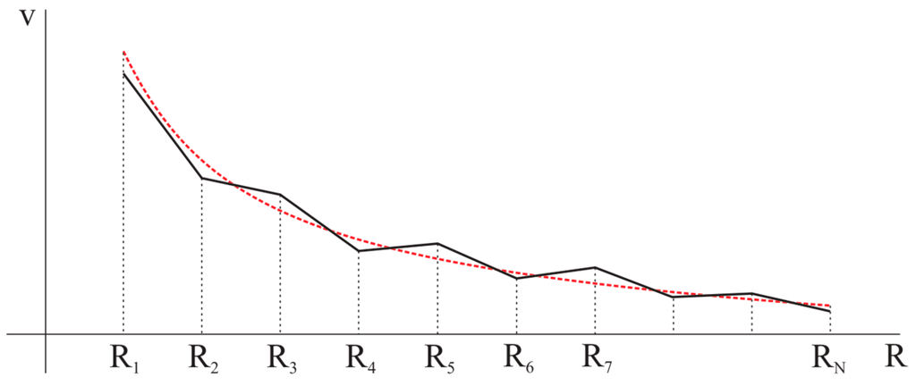 From Equation (14), for R = R1 there is obtained v = v1 for any n, in our case n > 0. For R = Ri, i = 2, 3, ..., N, from Equation (14), we can take that: , i = 2, 3, ..., N, from there the relation is obtained: