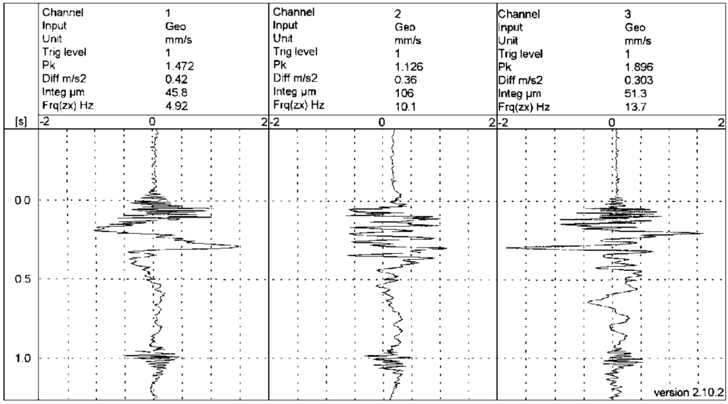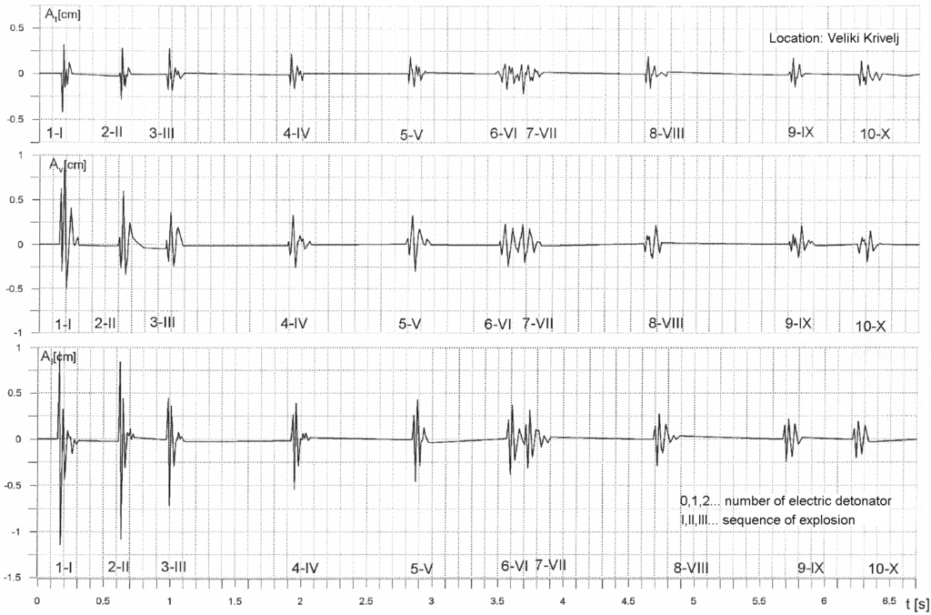 The measurements of shocks resulting from blasting in the Veliki Krivelj Open Pit were performed during blasting using half-second electric detonators. The delay time of initiation between boreholes was 0.5 s, which led to ten explosions and appropriate soil oscillation velocities.