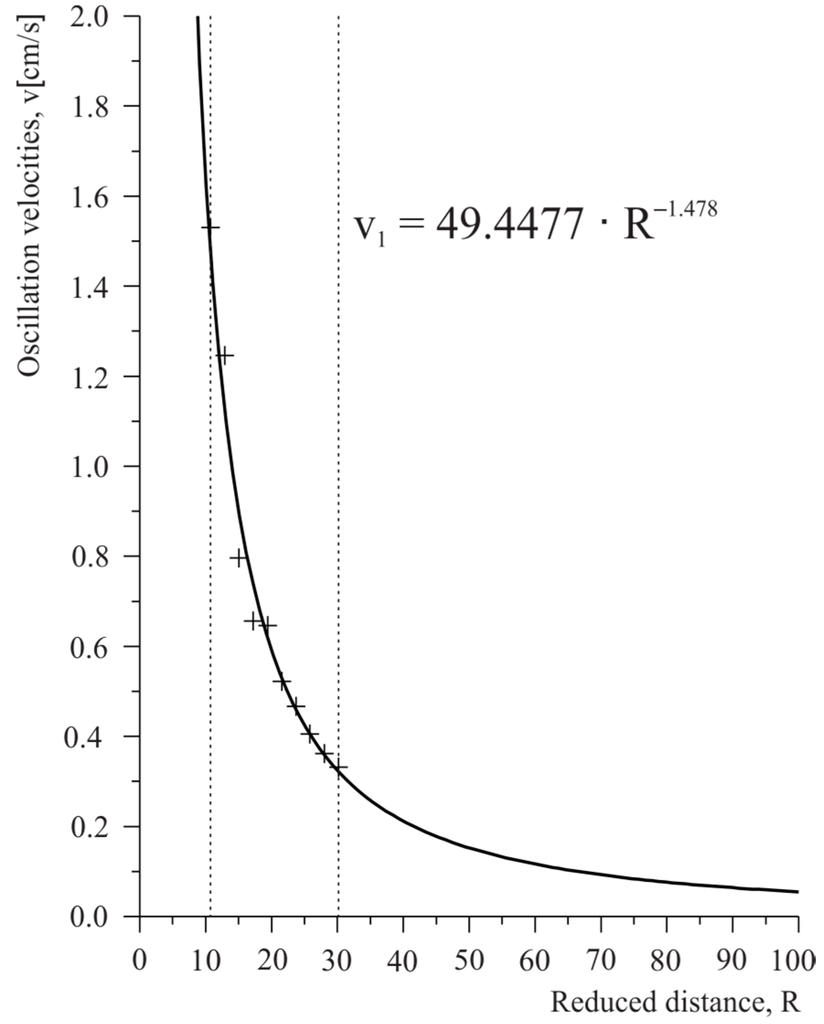Replacing the value for the parameter n in Equation (14), found in this way, we obtain the relation for the oscillation velocity of rock mass in the monitored environment . Thus, to determine the parameter n, all experimental data were taken into account.