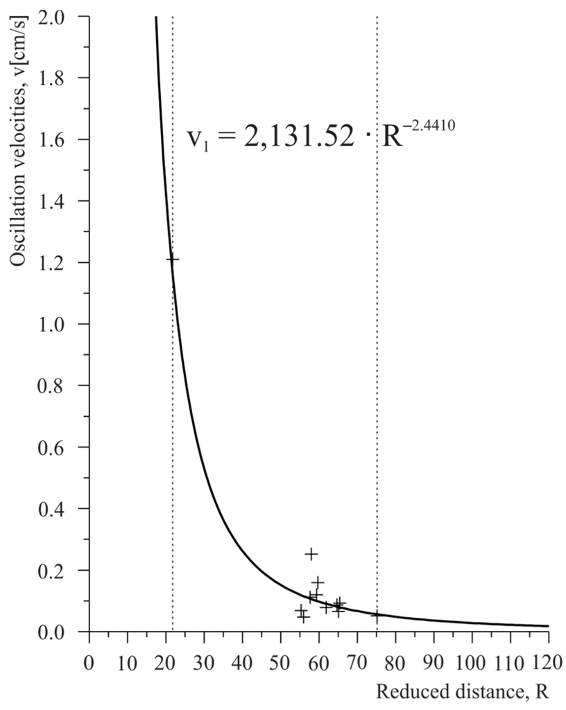 Thus, parameters n and K in Sadovskii’s law have been determined by three modes—models in the specific work environment. Their corresponding functions have been obtained presenting oscillation velocities of the rock mass depending on a reduced distance. The calculated corresponding indexes of the curved line correlation point out that there is a rather strong curved line relationship between a reduced distance and the oscillation velocity of the rock mass expressed in the obtained functions.