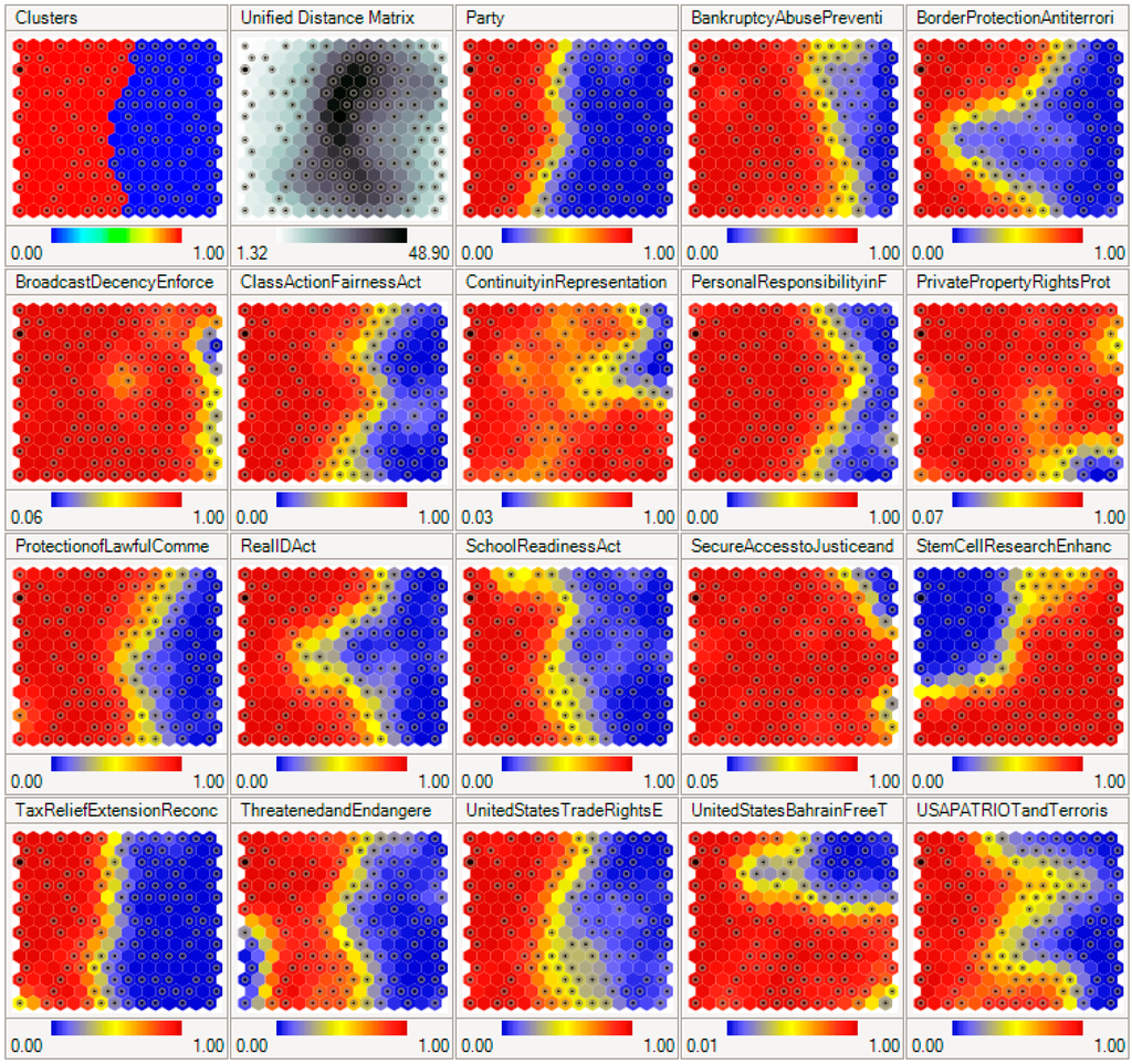 A self-organizing map showing U.S. Congress voting patterns visualized in Synapse. The first two boxes show clustering and distances, while the remaining ones show the component planes. Red means a yes vote, while blue means a no vote in the component planes (except the party component, where red is Republican and blue is Democratic) [42].