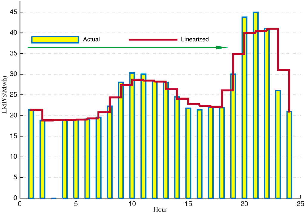 Actual and linearized one day Pennsylvania–New Jersey–Maryland (PJM) electricity price on 7 April 2002.