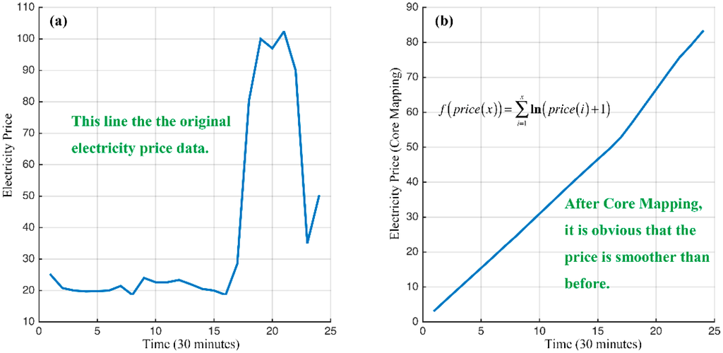 It is obvious that the volatility of mapped data is smaller than the volatility of actual data. This means that the CM method can reduce the volatility of data and consequently makes the accuracy of the forecasted electricity price much higher than that of the original method, which is shown in the experiments in Section 4.