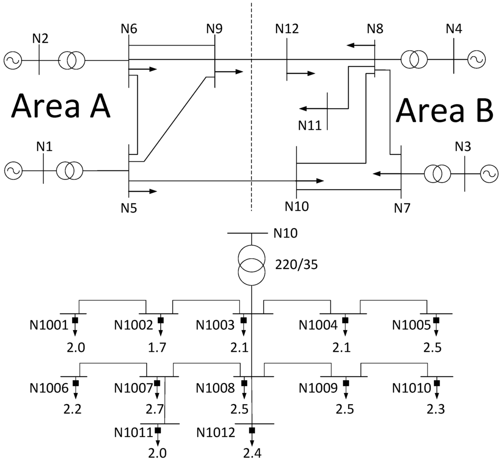 The test system used in this paper consists of two layers: the transmission level, which contains 4 generators, 12 buses, and a distribution network, with 12 load buses connected at bus N10 through a 220/35 (kV) transformer. Note that the scheme of this paper is implemented in the distribution network; the transmission level is used only to generate large disturbances of different degrees. The structure is shown in Figure 7.