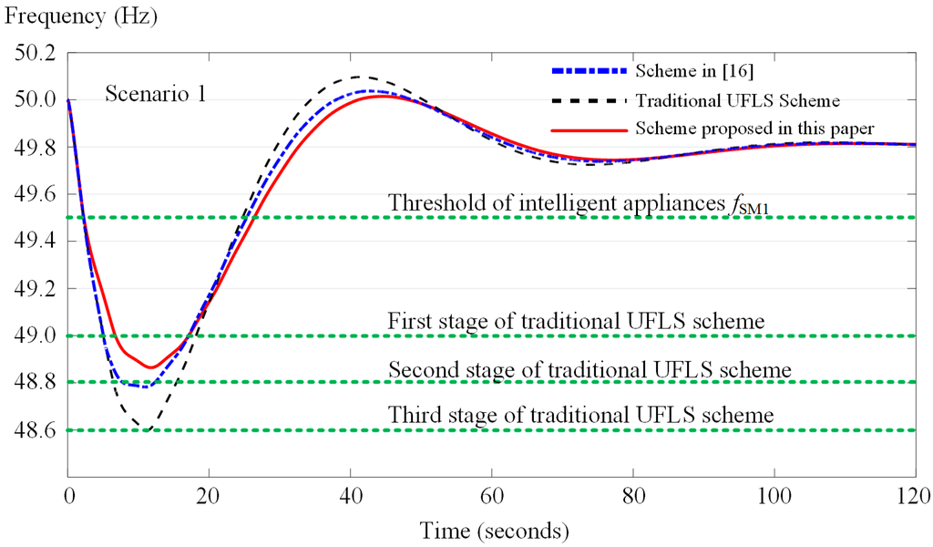 Compared to the other two UFLS schemes, the response rules of intelligent appliances have higher frequency thresholds in the new scheme, thereby preventing more serious frequency declines. Moreover, the critical intelligent appliances are turned on after several seconds of interruption, which has a positive effect on inhibiting frequency overshoot.