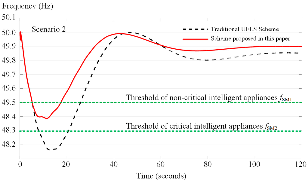 In this scenario, although the frequency can recover without any actions, the proposed scheme still cuts off some intelligent appliances when the frequency drops below 49.5 Hz to prevent the frequency from dropping to a critical value. In fact, without any actions, the frequency will drop to 48.16 Hz, which is close to the threshold value of UFLS. If the system operators want to avoid this outcome, the scheme can be changed by adjusting K.
