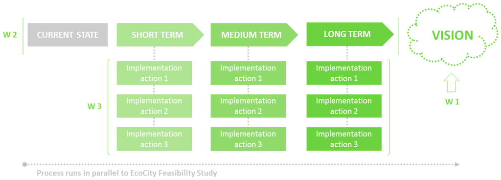 Figure 1 presents the outline of the roadmapping work, adapted for VTT EcoCity concept from Kazi and Wolf [], and applied for the first time in the project “EcoNBC, EcoCity Capacity Building in New Borg El Arab City (NBC)”, a project funded by the Institutional Cooperation Instrument (ICI) under the Ministry for Foreign Affairs of Finland. The strategic roadmapping and implementation actions method focuses on the achievement of three main goals: