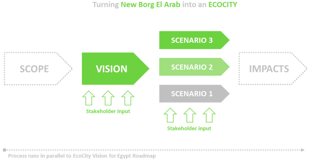 Precisely to enable local adaptation, several methodologies have been specifically developed and applied in different case studies. The purpose of this article is to describe those and to illustrate how they can support sustainable community regeneration and development through the results of a particular case study in Egypt related to the transformation of New Borg El Arab (NBC), near Alexandria, into an EcoCity. The importance of this transformation should be understood in the context of the enormous challenges faced by Egypt with regards to human settlements and the living conditions in those. Egyptian cities are increasingly struggling with social, cultural, economic and environmental problems like high unemployment, lack of housing, water scarcity, chaotic traffic, air pollution, noise, deficient infrastructure, etc. These problems cannot be solved with the same policies and strategies that have created the underlying systemic conditions, and therefore a new basic approach is necessary []. Hence the need for sustainable development, ecocities and for the methodologies presented here which, as a previous step, can mobilize the Egyptian stakeholders including planners and decision makers, by creating a constructive debate on the viability of the idea (in this case study, turning NBC into an EcoCity) supported by useful facts and figures to aid decision-making, and alternative approaches and solutions for putting the idea into practice. According to Joss’ analytical categories for profiling and comparing ecocity initiatives, the case study discussed here can be categorized as follows []: