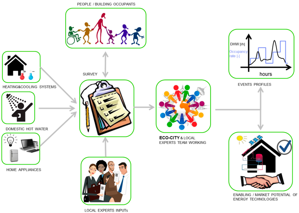 Thus, to investigate and to collect information about occupants’ energy related behaviour, in case measurements of direct energy consumption patterns are not available, a suitable instrument to adopt is an energy survey. Within the EcoNBC framework a specific survey, focused on five main aspects has been used: seasonal domestic hot water usage, natural ventilation mechanisms, shading systems, home appliances utilization (including lights), heating and cooling systems and related schedule. The results of the survey served to assess the market potential of energy technologies, ensuring an easy and successful deployment, and to draw events’ profiles related to occupants, which generate different energy consumption patterns along the year. Figure 3 shows the implementation process of the survey.
