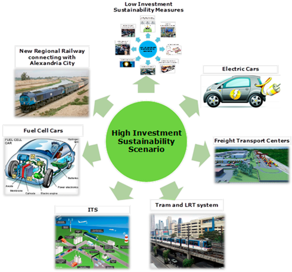 Egypt faces at present many challenges related to fast growing cities, economic difficulties and sustainable development. EcoCities should be seen as a way to answer all three, rather than pushing to promote one over the others. The proposed implementation actions aim to reduce the reliance on imported energy, reduce pollution and congestion, conserve resources and valuable nature while promoting local business and jobs, improving mobility, improving the urban environment, increasing the use of renewable resources and promoting the participation of citizens. Following Joss’ interpretation of the ecocity evolution, the methodologies developed to assess and support the transformation of New Borg El Arab into an EcoCity present elements of Phase I (1980s to early 1090s: grassroots movement/visions) and Phase III (2000s to present: global expansion/policy mainstreaming). Even though the Egyptian case can be considered an example of Phase III, it begins with the definition of a vision in which local experts and stakeholders had a fundamental role []. Perhaps the main difference is that the vision defined had to remain ambitious and yet possible—provided the necessary political and social commitment exists—in order to overcome the existing initial gap between ambition and realization that, according to Barton, characterized Phase I ecocity projects [].