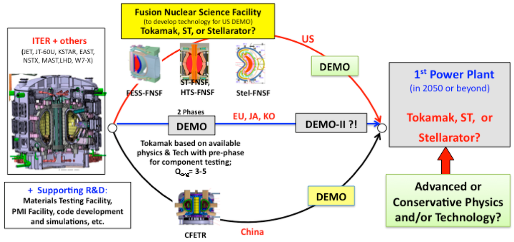 - Menard, J.E.; Bromberg, L.; Brown, T.; Burgess, T.; Dix, D.; El-Guebaly, L.; Gerrity, T.; Goldston, R.J.; Hawryluk, R.J.; Kastner, R.; et al. Prospects for pilot plants based on the tokamak, spherical tokamak, and stellarator. Nuclear Fusion 2011, 51, 103014. [Google Scholar] [CrossRef]