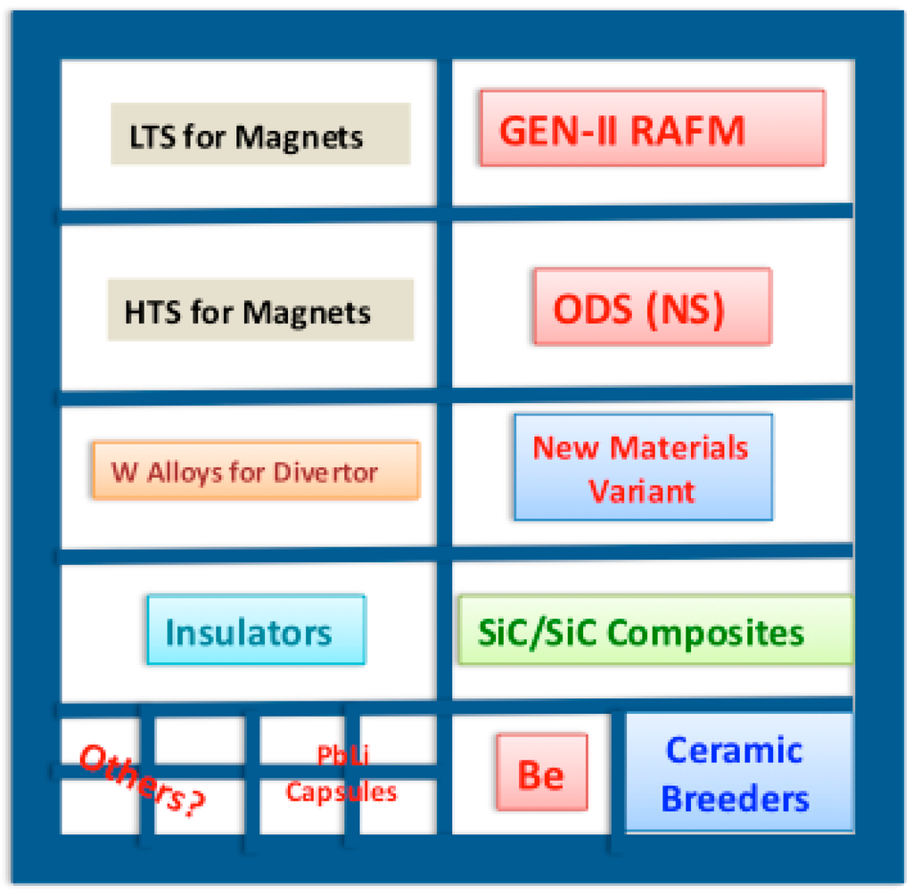 - Stork, D.; Agostini, P.; Boutard, J.-L.; Buckthorpe, D.; Diegele, E.; Dudarev, S.L.; English, C.; Federici, G.; Gilbert, M.R.; Gonzalez, S.; et al. Materials R&D for a timely DEMO: Key findings and recommendations of the EU Roadmap assessment group. Fusion Eng. Design 2014, 89, 1586–1594. [Google Scholar]