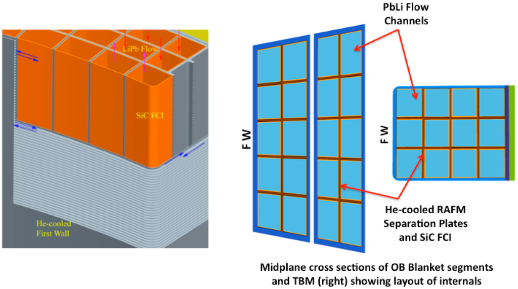 - Sharafat, S.; Aoyama, A.; Morley, N.; Smolentsev, S.; Katoh, Y.; Williams, B.; Ghoniem, N. Development status of an SiC-foam based flow channel insert for a U.S.-ITER DCLL TBM. Fusion Sci. Technol. 2009, 56, 883–891. [Google Scholar]